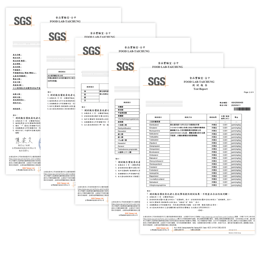 通過 SGS 檢驗,確認含有鋅、鐵、水解胺基酸、色胺酸等多元營養素,並完成 815 項安全檢測,包含重金屬、動物用藥賀爾蒙、西藥、瘦肉精、農藥,全數未檢出,安心看得見