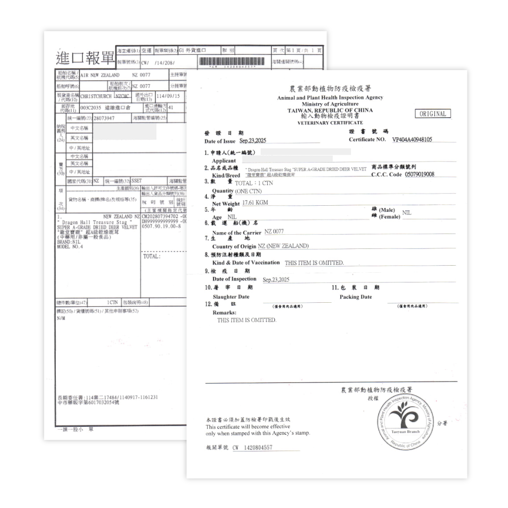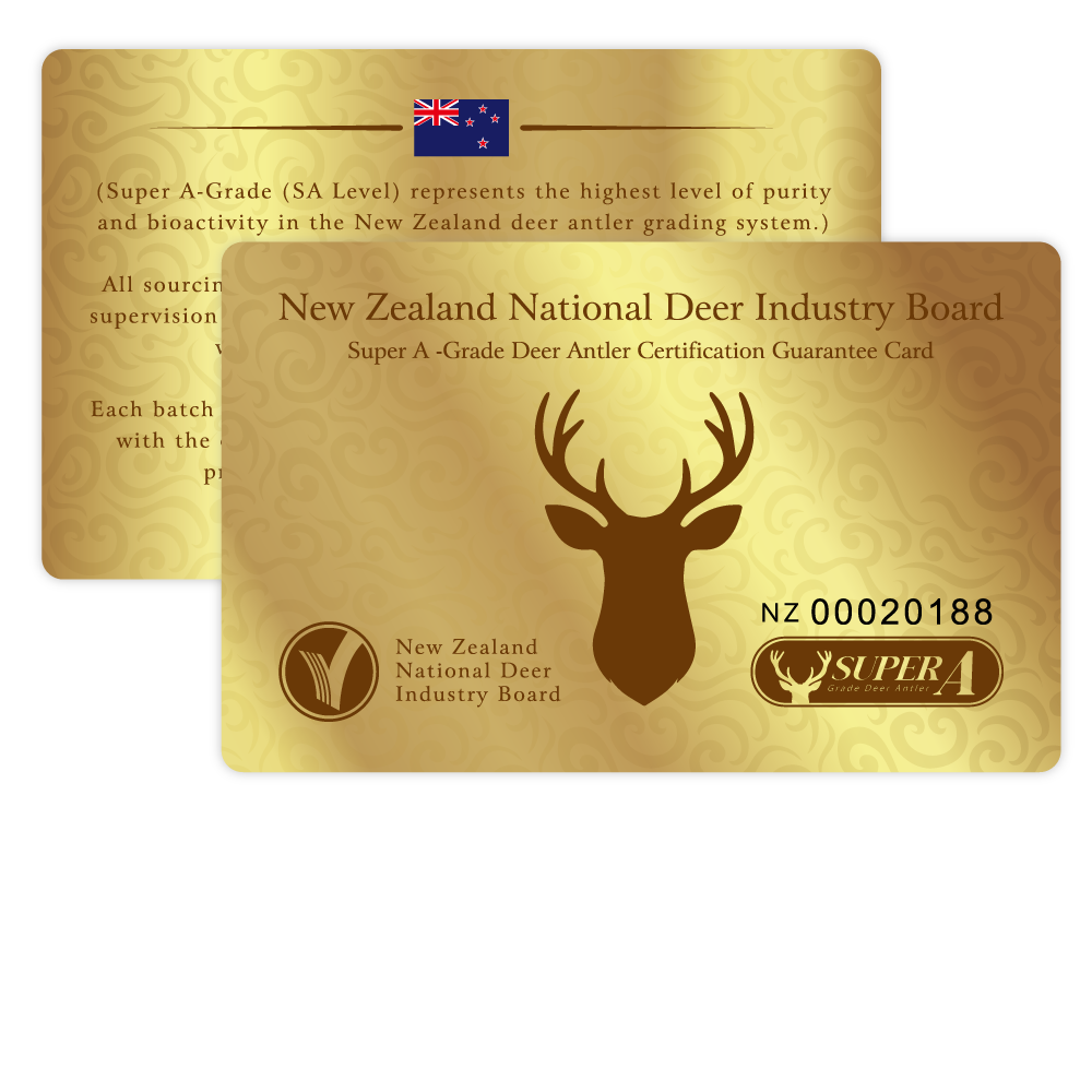 由紐西蘭國家鹿業局認證,每盒皆附官方保證卡與專屬流水號 ,來源百分百透明、真實可追溯!因為只有純100%紐西蘭超A級鹿茸才配擁有這份最高等級的身分證明。